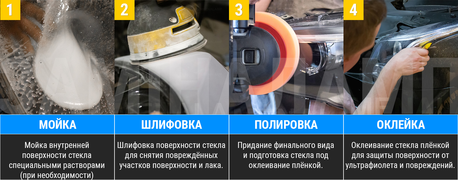 1) сперва нужно отшлифовать стекло фары — это подразумевает снятие заводского лака и выравнивание поверхности стекла фары от мелких сколов,