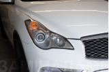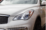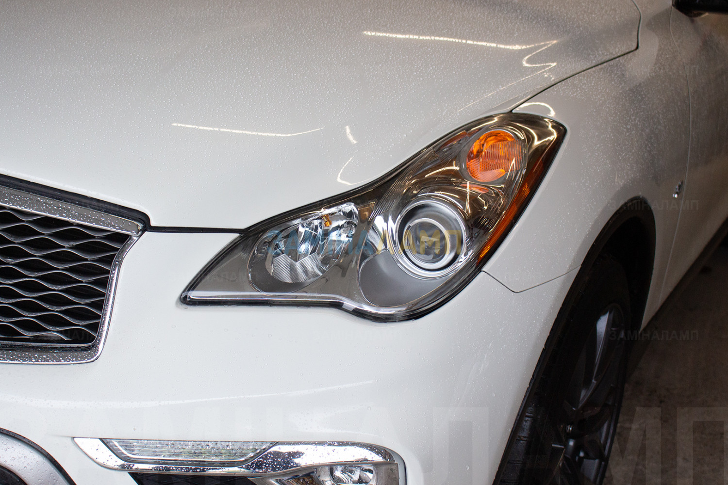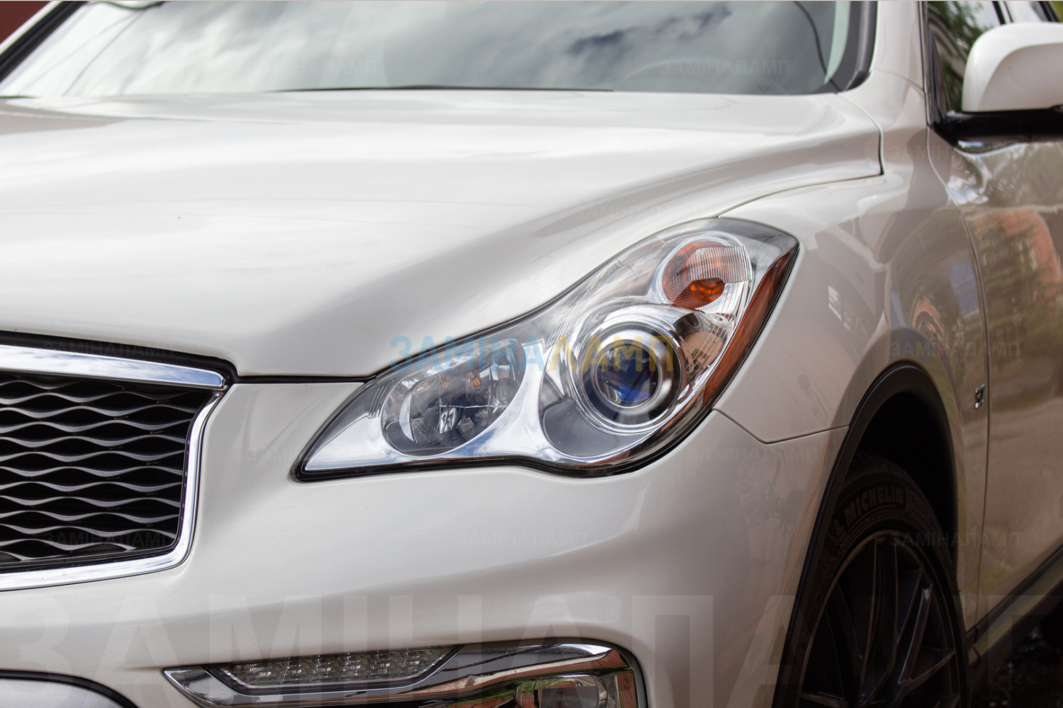 Зовнішній вигляд лівої фари Infiniti QX50 ДО початку робіт із заміни штатних лінз на біксенонові лінзи Hella F1.
