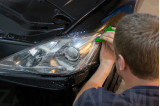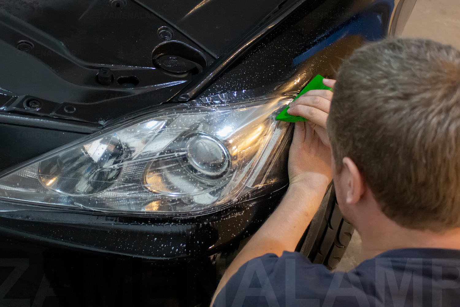 Процес бронювання скла фар та ПТФ поліуретановою плівкою.