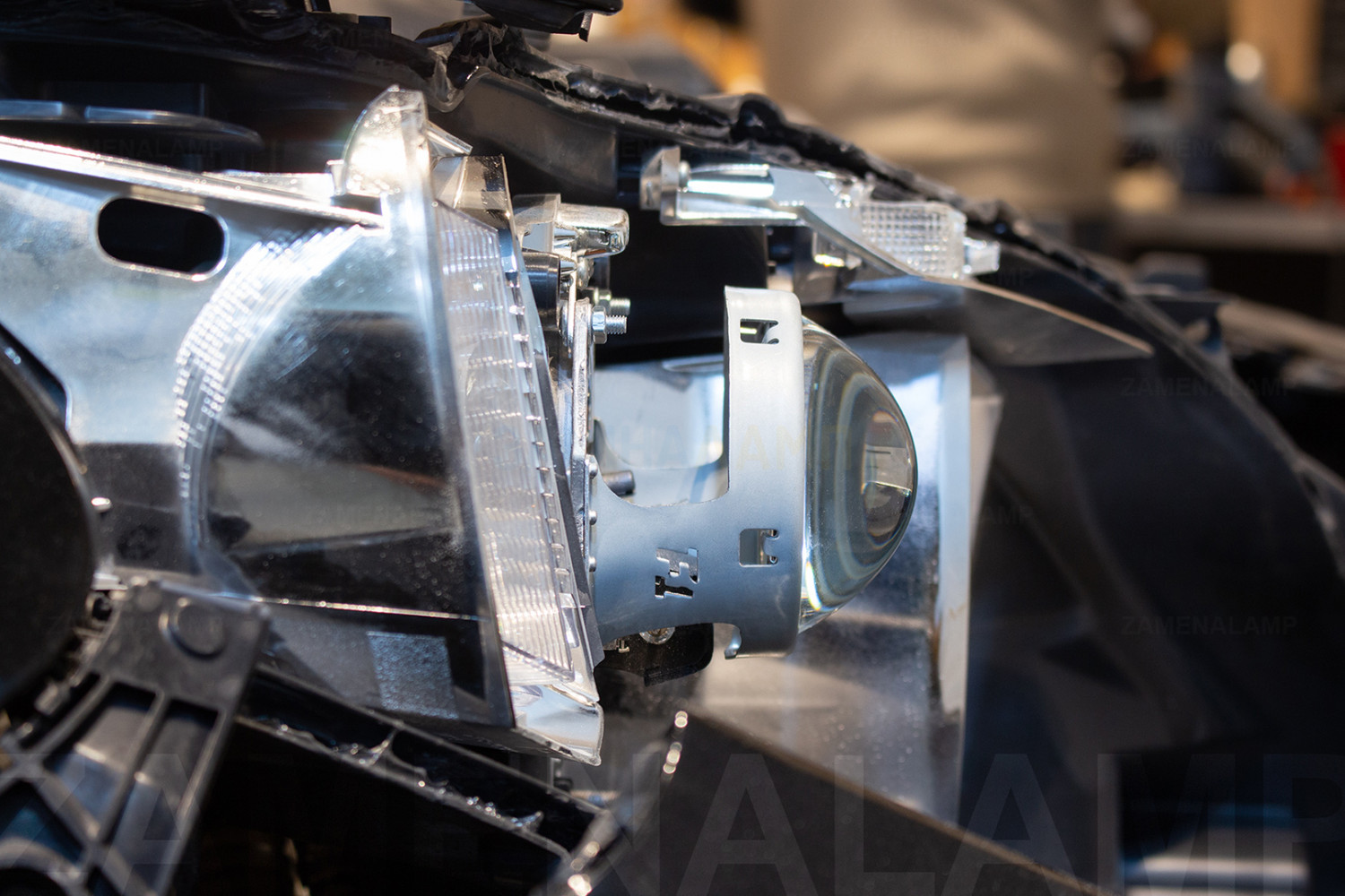 Закріпили біксенонову лінзу Hella F1 у механізмі правої фари за допомогою перехідної рамки.