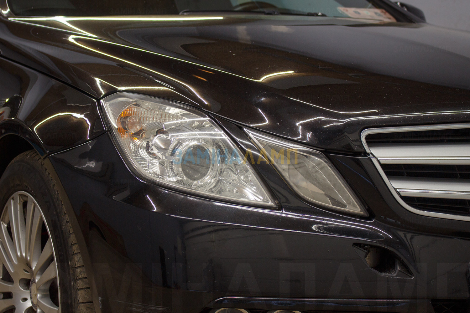 Зовнішній вигляд правої фари Mercedes Benz E-class Coupe C207 ДО початку робіт із заміни штатних галогенних лінз на світлодіодні Bi-Led T-Rex Pro.