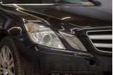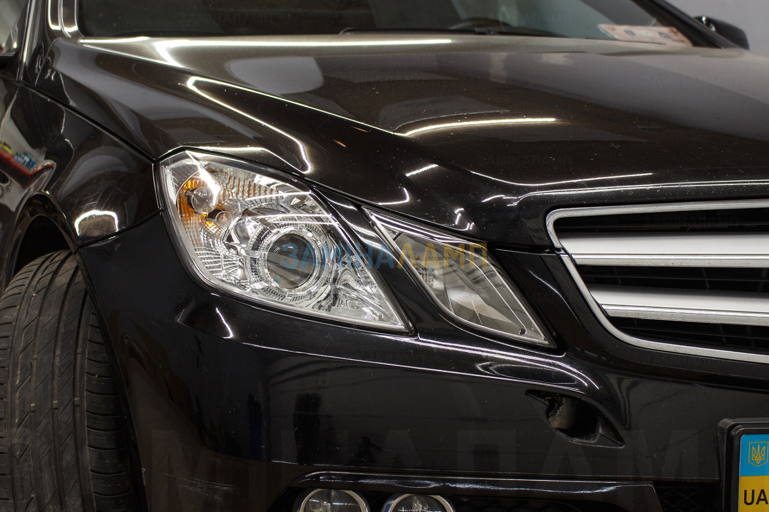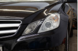 Зовнішній вигляд лівої фари Mercedes Benz E-class Coupe C207 ПІСЛЯ заміни штатних галогенних лінз на Bi-Led T-Rex Pro та бронювання поліуретановою плівкою.