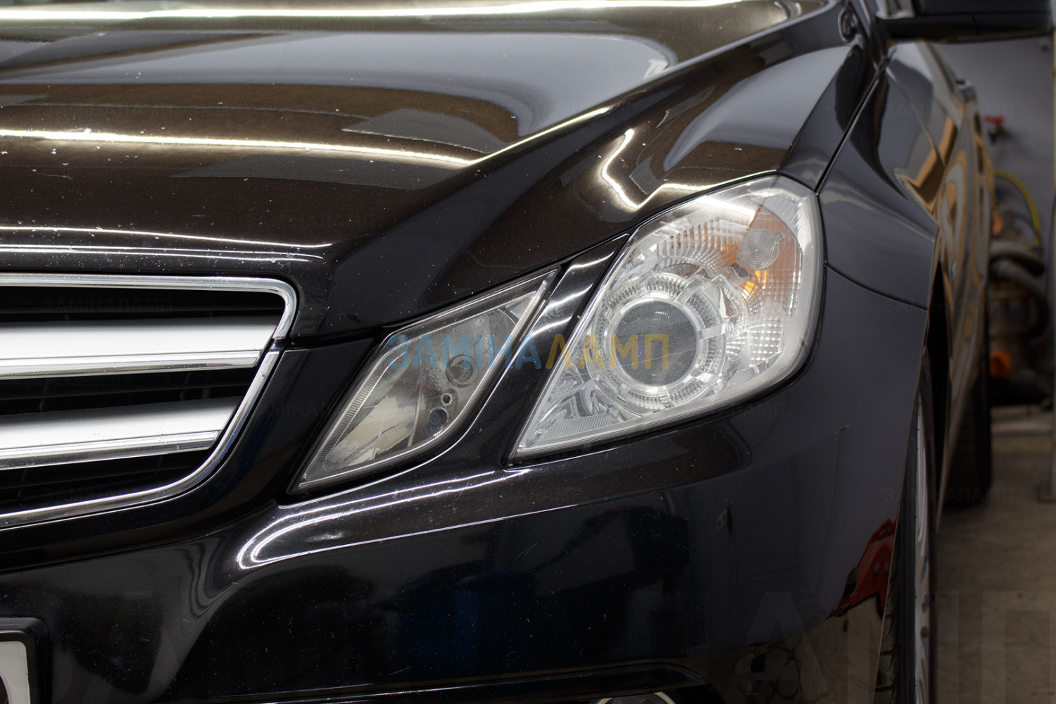 Зовнішній вигляд правої фари Mercedes Benz E-class Coupe C207 ПІСЛЯ заміни штатних галогенних лінз на Bi-Led T-Rex Pro та бронювання поліуретановою плівкою.