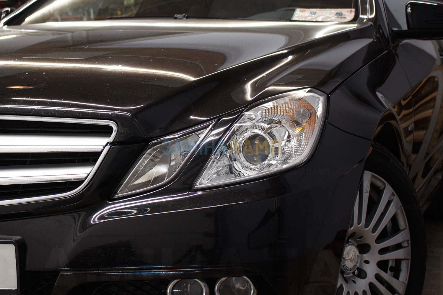 Зовнішній вигляд лівої фари Mercedes Benz E-class Coupe C207 ДО початку робіт із заміни штатних галогенних лінз на світлодіодні Bi-Led T-Rex Pro.