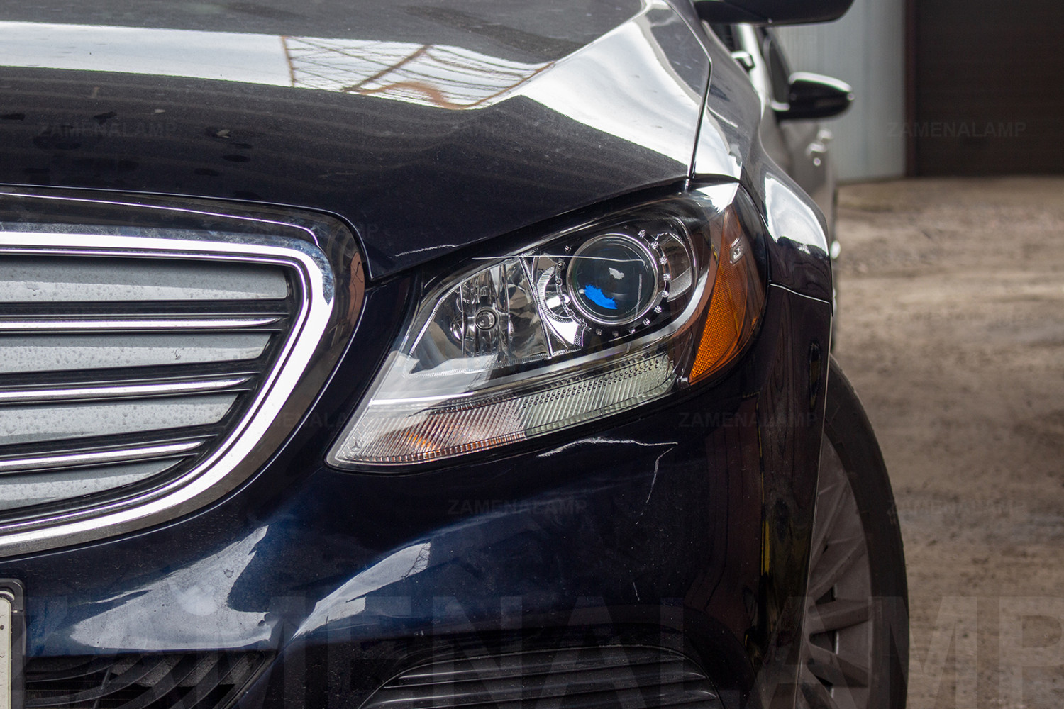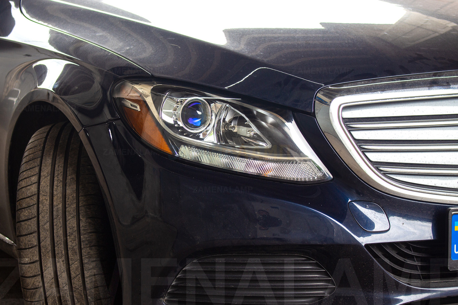 Зовнішній вигляд правої фари Mercedes-Benz W205 ПІСЛЯ встановлення біксенонових лінз Hella 3R Mate Glass.