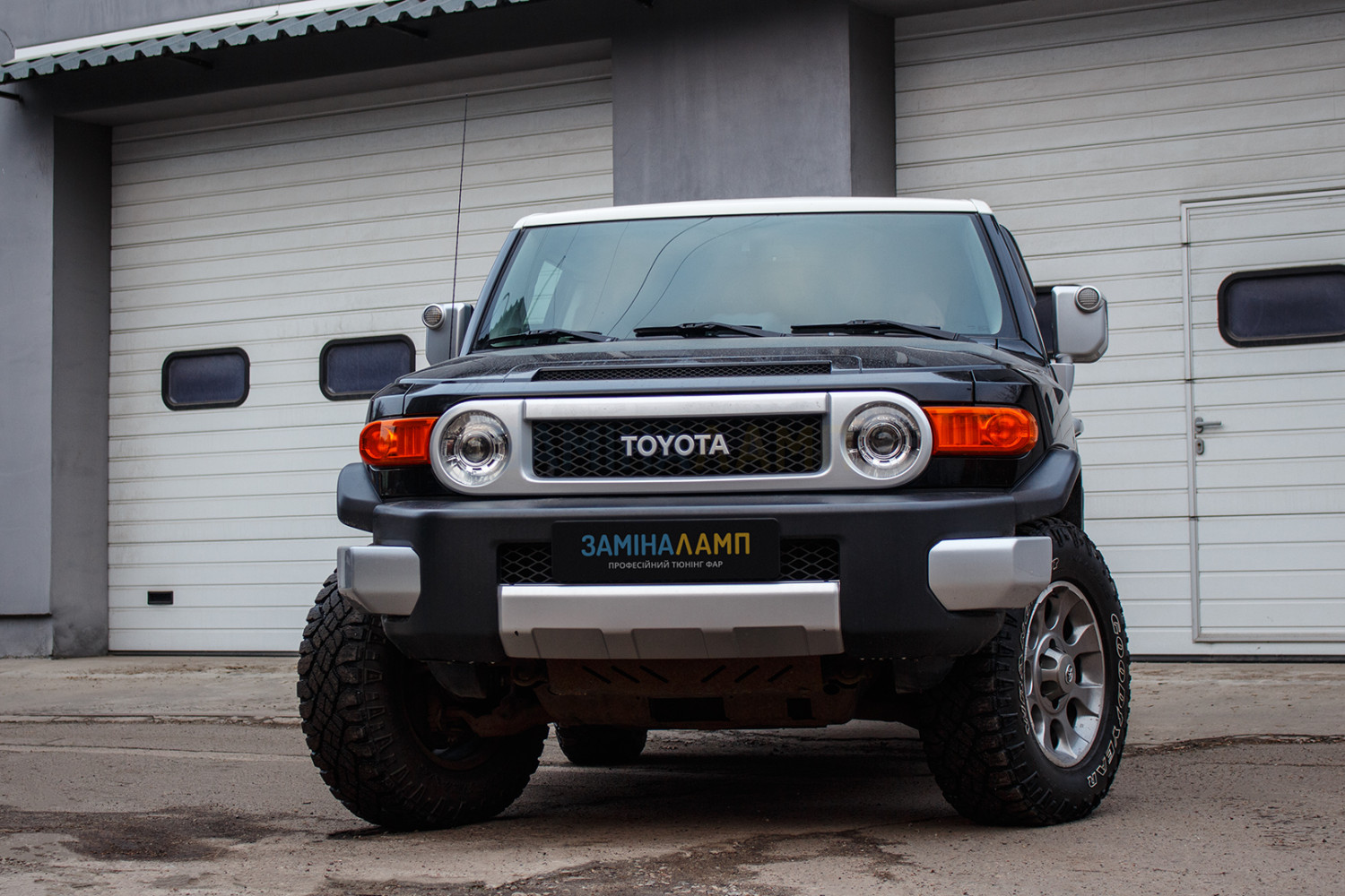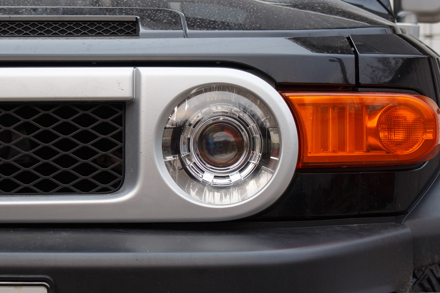 Зовнішній вигляд лівої фари Toyota FJ Cruiser ПІСЛЯ встановлення біксенонових лінз Hella 5 та бронювання поліуретановою плівкою.