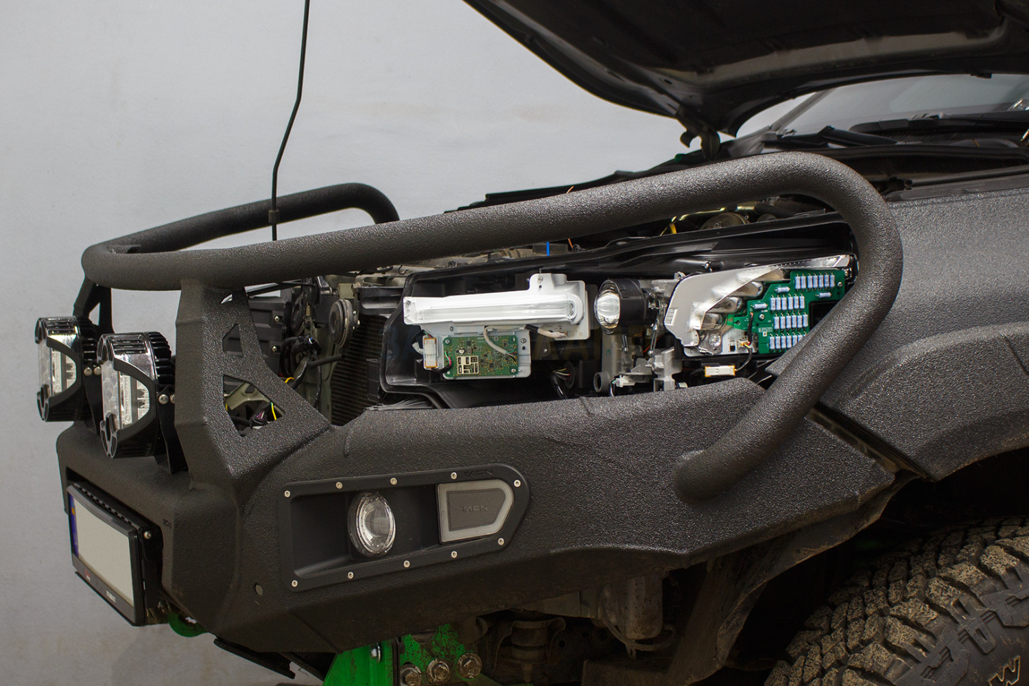 Зовнішній вигляд лівої фари Toyota Hilux після заміни штатних LED-лінз на світлодіодні лінзи Bi-Led T-Rex Pro 2.5".