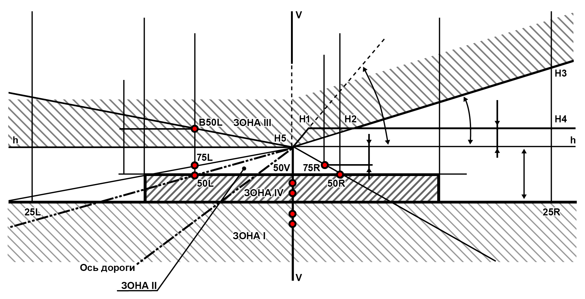 с другой стороны, она не должна выходить ни за горизонтальную линию hT-hT, на 22,5 см выше прямой линии HH, проходящей через точки 2, и H5, H3, H4, ни выше прямой линии H3 H2, наклоненной под углом. 15° над горизонтом.