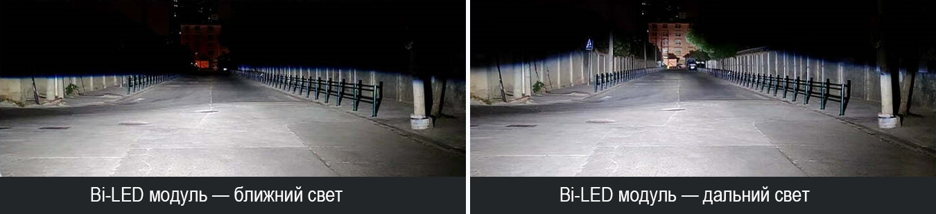 Bi-LED линза с двумя светодиодами обеспечивает превосходный дальний и ближний свет, а ближний свет очень равномерный, без темных участков и светлых пятен, при этом дальний свет остается очень сфокусированным.